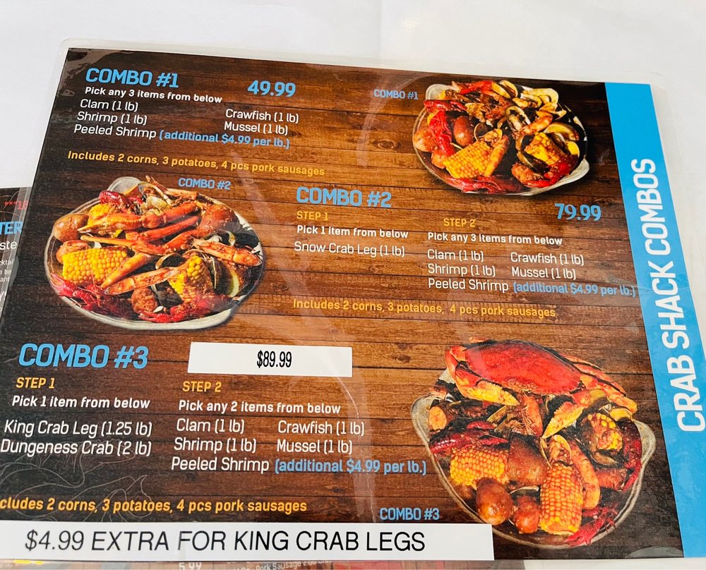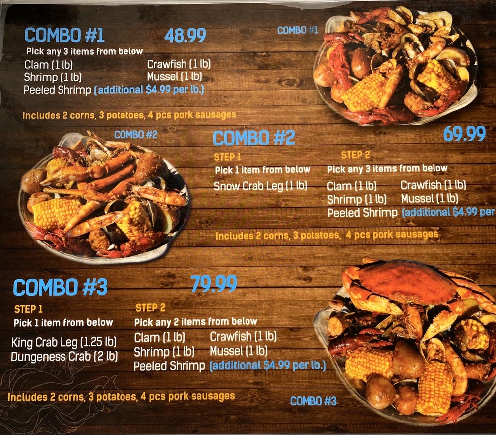The menu features a delectable Combo #1 with 3 lbs of seafood, corn, potatoes, and sausages, all seasoned to perfection. For a crab leg lover, Combo #2 offers a satisfying mix of Snow Crab legs and additional seafood items. The fresh brewed drinks and fountain selections complement the seafood feast perfectly.